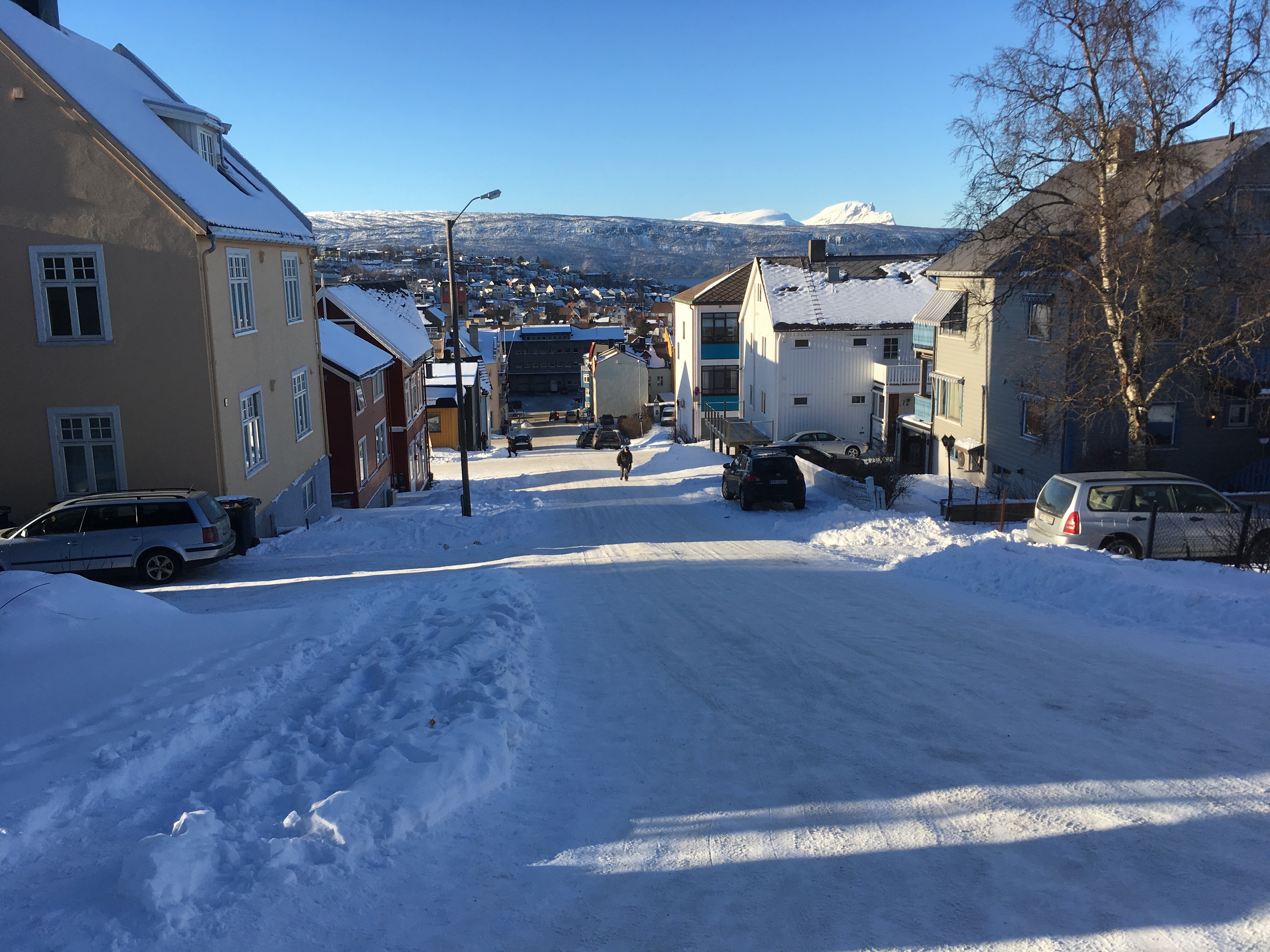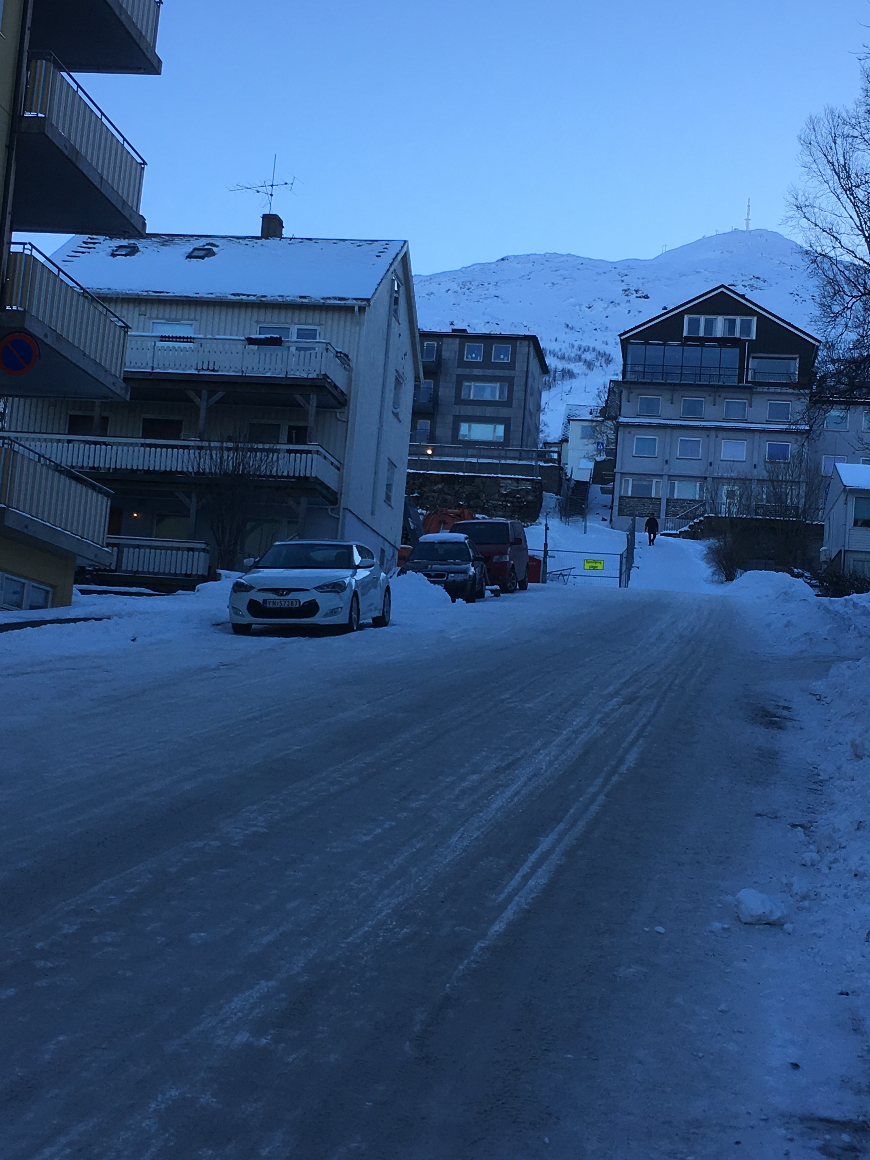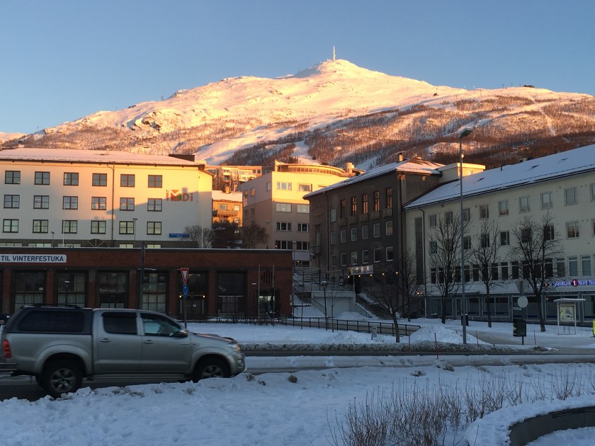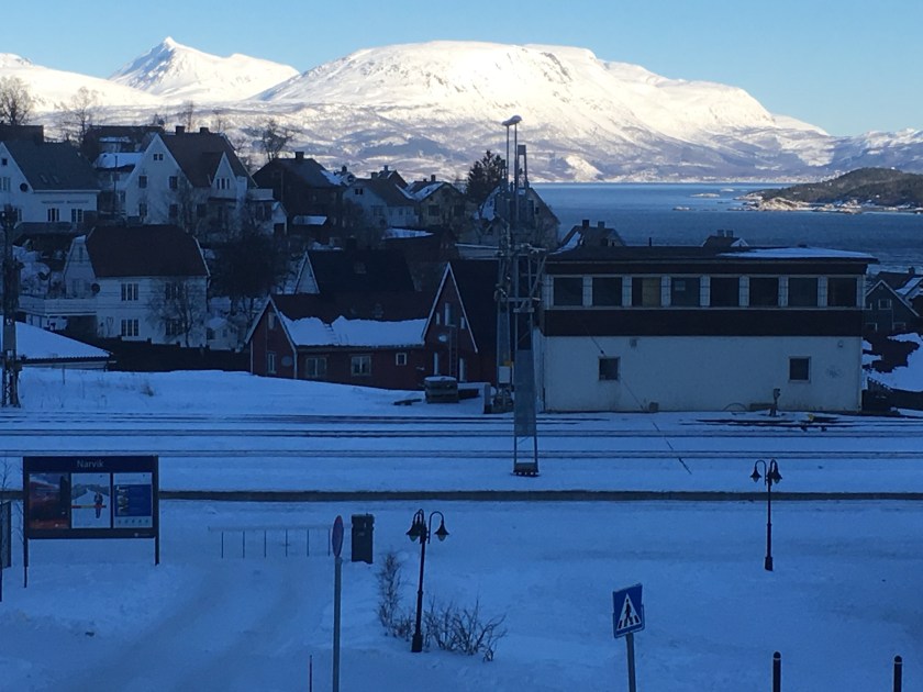 As always when we arrive in a new place it takes us a while to get our bearings. Luckily places like the bus station and train station are usually close together and have visitor information available also the maps app on my iPhone has been invaluable. First impressions of Narvik on leaving the bus station that it is extremely cold, this is the furthest north we have been and it is a long way above the arctic circle so cold was expected. Also there is a lot of snow. The immediate thing that struck us was that every street was uphill, Narvik is built at the base of a mountain on the edge of a fjord.