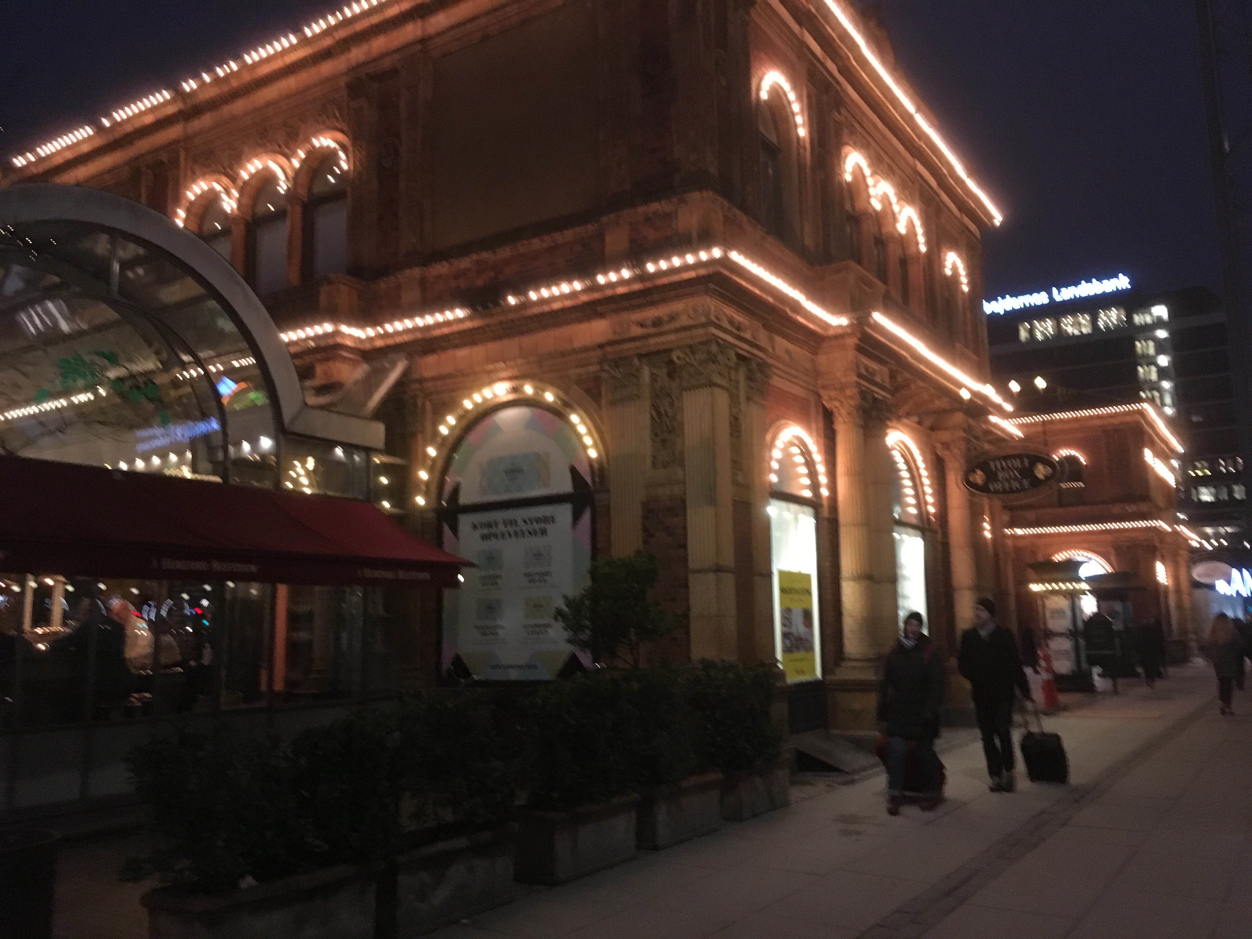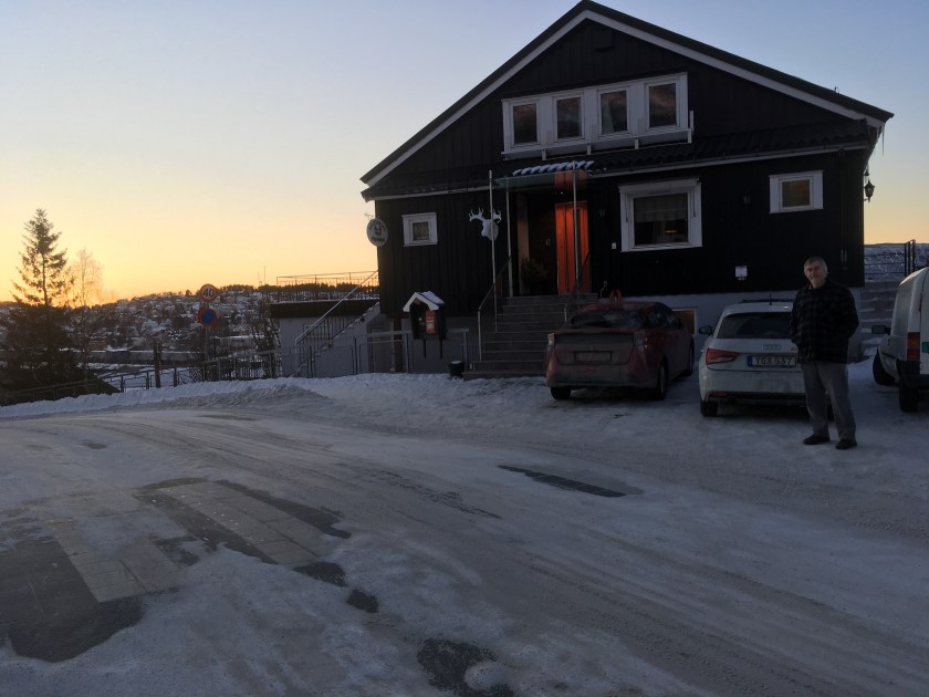 Dominating the skyline is a huge ski run lit up in all its glory. We are staying at the Breidablikk Guesthouse which is between the ski slope and train station.